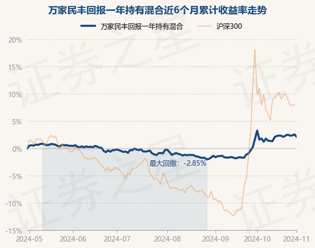 证券之星消息,11月1日,万家民丰回报一年持有混合最新单位净值为1.1136元,累计净值为1.1136元,较前一交易日下跌0.43%。历史数据显示该基金近1个月上涨0.38%,近3个月上涨2.39%,近6个月上涨2.14%,近1年上涨5.45%。该基金近6个月的累计收益率走势如下图: