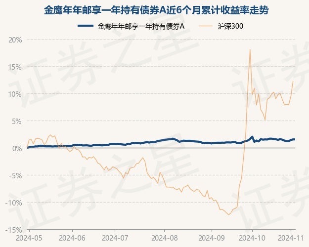 证券之星消息,11月4日,金鹰年年邮享一年持有债券A最新单位净值为1.0653元,累计净值为1.0653元,较前一交易日上涨0.0%。历史数据显示该基金近1个月下跌0.08%,近3个月上涨0.04%,近6个月上涨1.55%,近1年上涨4.61%。该基金近6个月的累计收益率走势如下图: