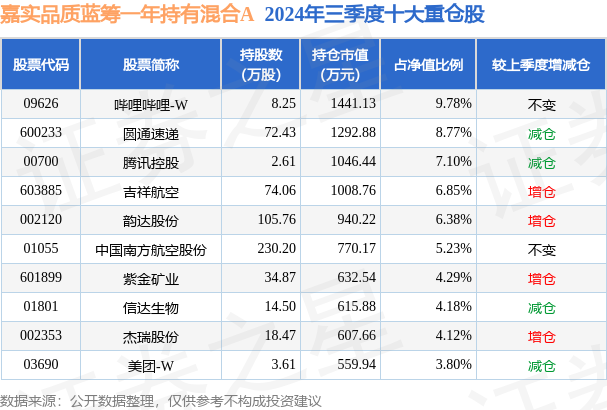 嘉实品质蓝筹一年持有混合A为混合型-偏股基金,根据最新一期基金季报显示,该基金资产配置:股票占净值比93.89%,债券占净值比0.07%,现金占净值比6.14%。基金十大重仓股如下: