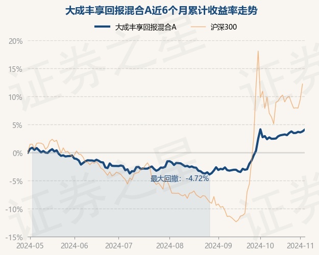 证券之星消息,11月4日,大成丰享回报混合A最新单位净值为1.088元,累计净值为1.088元,较前一交易日上涨0.17%。历史数据显示该基金近1个月上涨1.28%,近3个月上涨5.62%,近6个月上涨3.78%,近1年上涨6.03%。该基金近6个月的累计收益率走势如下图: