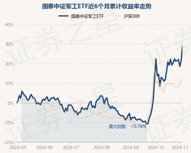 证券之星消息,11月4日,国泰中证军工ETF最新单位净值为1.0787元,累计净值为1.0787元,较前一交易日上涨2.35%。历史数据显示该基金近1个月上涨8.29%,近3个月上涨18.17%,近6个月上涨21.31%,近1年上涨11.39%。该基金近6个月的累计收益率走势如下图:
