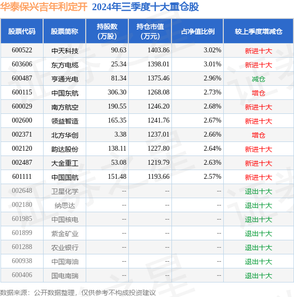 华泰保兴吉年利定开为混合型-偏股基金,根据最新一期基金季报显示,该基金资产配置:股票占净值比90.44%,无债券类资产,现金占净值比11.24%。基金十大重仓股如下: