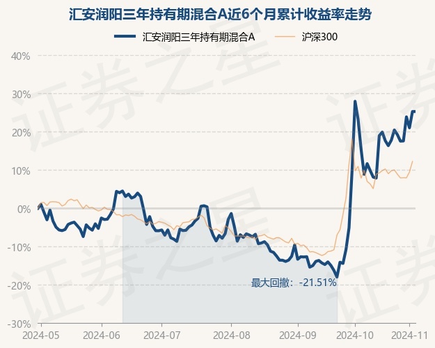 证券之星消息,11月5日,汇安润阳三年持有期混合A最新单位净值为0.8626元,累计净值为0.8626元,较前一交易日上涨0.0%。历史数据显示该基金近1个月上涨17.5%,近3个月上涨41.16%,近6个月上涨29.04%,近1年上涨9.8%。该基金近6个月的累计收益率走势如下图: