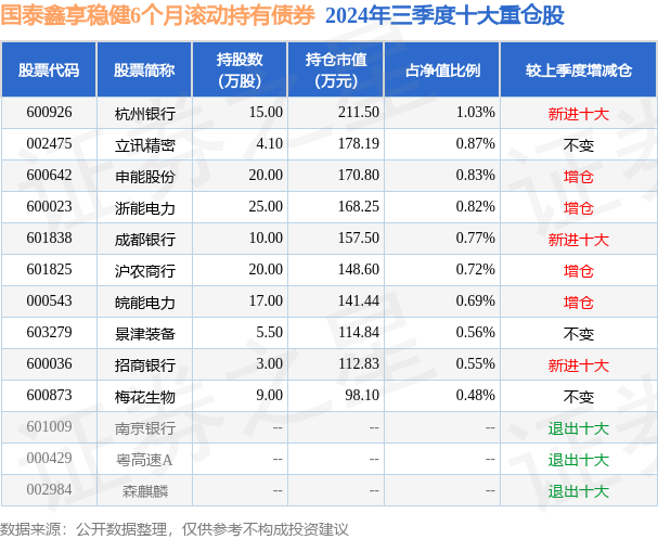 国泰鑫享稳健6个月滚动持有债券为债券型-混合二级基金,根据最新一期基金季报显示,该基金资产配置:股票占净值比12.69%,债券占净值比71.88%,现金占净值比8.24%。基金十大重仓股如下: