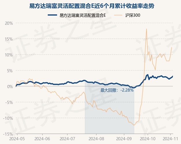 证券之星消息,11月5日,易方达瑞富灵活配置混合E最新单位净值为1.419元,累计净值为1.559元,较前一交易日上涨0.35%。历史数据显示该基金近1个月下跌0.21%,近3个月上涨2.16%,近6个月上涨3.12%,近1年上涨7.66%。该基金近6个月的累计收益率走势如下图: