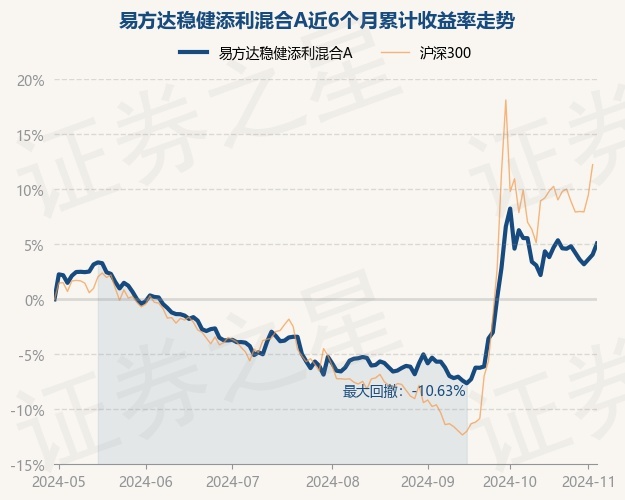 证券之星消息,11月5日,易方达稳健添利混合A最新单位净值为0.9838元,累计净值为0.9838元,较前一交易日上涨0.98%。历史数据显示该基金近1个月下跌1.44%,近3个月上涨12.45%,近6个月上涨5.07%,近1年上涨7.4%。该基金近6个月的累计收益率走势如下图: