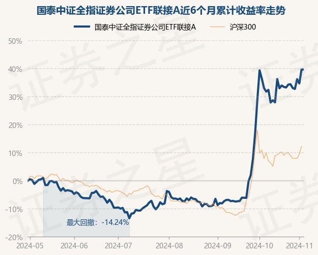 证券之星消息,11月5日,国泰中证全指证券公司ETF联接A最新单位净值为1.1973元,累计净值为1.1973元,较前一交易日上涨0.0%。历史数据显示该基金近1个月上涨13.73%,近3个月上涨56.76%,近6个月上涨46.71%,近1年上涨36.88%。该基金近6个月的累计收益率走势如下图: