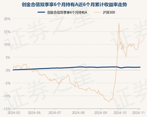 证券之星消息,11月5日,创金合信双季享6个月持有A最新单位净值为1.155元,累计净值为1.155元,较前一交易日上涨0.0%。历史数据显示该基金近1个月上涨0.13%,近3个月下跌0.09%,近6个月上涨1.12%,近1年上涨4.34%。该基金近6个月的累计收益率走势如下图:
