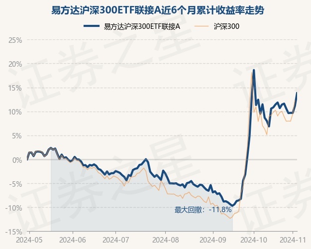 证券之星消息,11月5日,易方达沪深300ETF联接A最新单位净值为1.5904元,累计净值为1.5904元,较前一交易日上涨2.41%。历史数据显示该基金近1个月上涨0.83%,近3个月上涨19.8%,近6个月上涨13.8%,近1年上涨14.63%。该基金近6个月的累计收益率走势如下图: