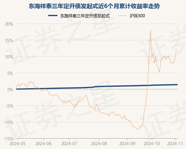 证券之星消息,11月5日,东海祥泰三年定开债发起式最新单位净值为1.0326元,累计净值为1.1266元,较前一交易日上涨0.01%。历史数据显示该基金近1个月上涨0.22%,近3个月上涨0.55%,近6个月上涨1.39%,近1年上涨2.43%。该基金近6个月的累计收益率走势如下图: