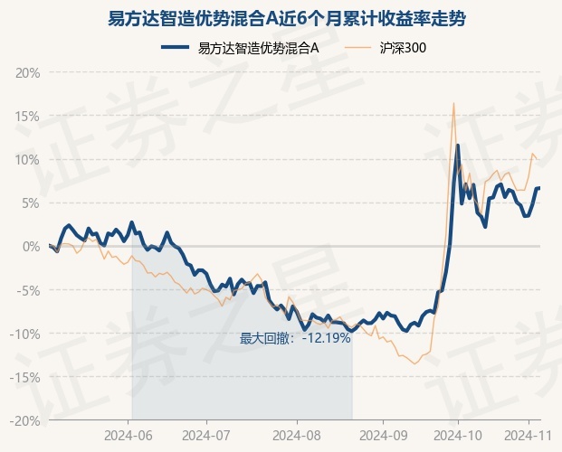 证券之星消息,11月6日,易方达智造优势混合A最新单位净值为0.9797元,累计净值为0.9797元,较前一交易日上涨0.06%。历史数据显示该基金近1个月下跌0.56%,近3个月上涨17.26%,近6个月上涨6.62%,近1年上涨20.47%。该基金近6个月的累计收益率走势如下图:
