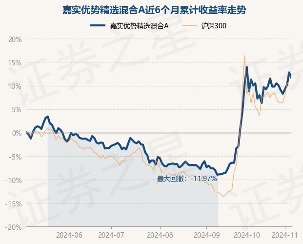 证券之星消息,11月6日,嘉实优势精选混合A最新单位净值为0.8625元,累计净值为0.8625元,较前一交易日下跌0.98%。历史数据显示该基金近1个月上涨1.18%,近3个月上涨20.39%,近6个月上涨11.72%,近1年上涨11.25%。该基金近6个月的累计收益率走势如下图: