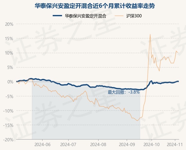 证券之星消息,11月6日,华泰保兴安盈定开混合最新单位净值为1.3619元,累计净值为1.3619元,较前一交易日下跌0.04%。历史数据显示该基金近1个月上涨0.11%,近3个月上涨1.55%,近6个月上涨0.04%,近1年上涨0.18%。该基金近6个月的累计收益率走势如下图: