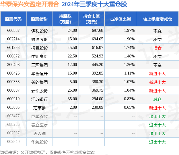 华泰保兴安盈定开混合为混合型-偏债基金,根据最新一期基金季报显示,该基金资产配置:股票占净值比14.58%,债券占净值比93.58%,现金占净值比0.47%。基金十大重仓股如下: