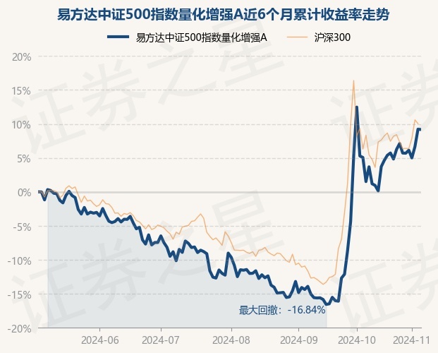 证券之星消息,11月6日,易方达中证500指数量化增强A最新单位净值为0.9442元,累计净值为0.9442元,较前一交易日下跌0.04%。历史数据显示该基金近1个月上涨3.64%,近3个月上涨23.31%,近6个月上涨9.18%,近1年上涨12.3%。该基金近6个月的累计收益率走势如下图: