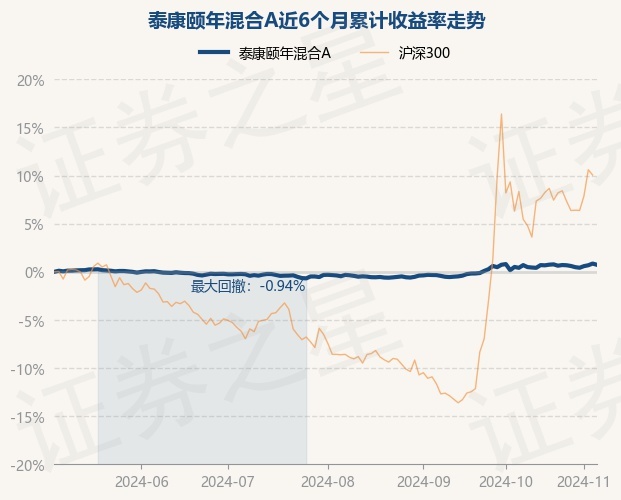 证券之星消息,11月6日,泰康颐年混合A最新单位净值为1.3238元,累计净值为1.3238元,较前一交易日下跌0.13%。历史数据显示该基金近1个月下跌0.01%,近3个月上涨1.19%,近6个月上涨0.72%,近1年上涨3.13%。该基金近6个月的累计收益率走势如下图: