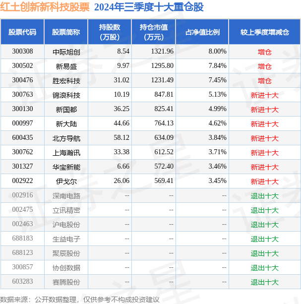 红土创新新科技股票为股票型基金,根据最新一期基金季报显示,该基金资产配置:股票占净值比94.42%,无债券类资产,现金占净值比5.48%。基金十大重仓股如下: