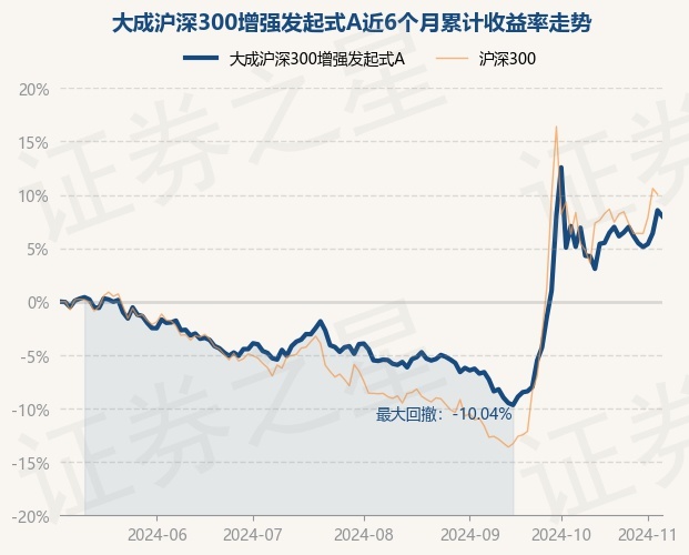 证券之星消息,11月6日,大成沪深300增强发起式A最新单位净值为0.8397元,累计净值为0.8397元,较前一交易日下跌0.51%。历史数据显示该基金近1个月下跌0.08%,近3个月上涨14.34%,近6个月上涨8.0%,近1年上涨14.35%。该基金近6个月的累计收益率走势如下图: