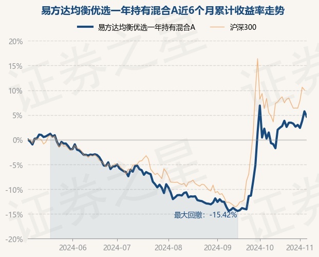 证券之星消息,11月6日,易方达均衡优选一年持有混合A最新单位净值为1.0912元,累计净值为1.0912元,较前一交易日下跌1.02%。历史数据显示该基金近1个月上涨3.15%,近3个月上涨18.47%,近6个月上涨4.66%,近1年上涨6.12%。该基金近6个月的累计收益率走势如下图: