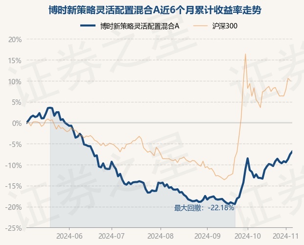 证券之星消息,11月6日,博时新策略灵活配置混合A最新单位净值为1.3314元,累计净值为1.3839元,较前一交易日上涨0.72%。历史数据显示该基金近1个月上涨4.6%,近3个月上涨9.18%,近6个月下跌6.88%,近1年下跌11.26%。该基金近6个月的累计收益率走势如下图:
