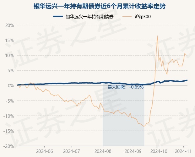证券之星消息,11月6日,银华远兴一年持有期债券最新单位净值为1.0605元,累计净值为1.0605元,较前一交易日上涨0.0%。历史数据显示该基金近1个月上涨0.36%,近3个月上涨0.79%,近6个月上涨1.62%,近1年上涨3.1%。该基金近6个月的累计收益率走势如下图: