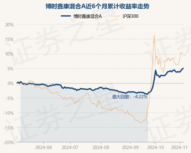 证券之星消息,11月6日,博时鑫康混合A最新单位净值为1.0774元,累计净值为1.1158元,较前一交易日上涨0.24%。历史数据显示该基金近1个月上涨3.7%,近3个月上涨6.95%,近6个月上涨5.07%,近1年上涨0.61%。该基金近6个月的累计收益率走势如下图: