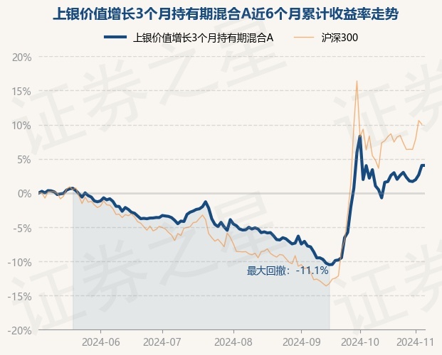 证券之星消息,11月6日,上银价值增长3个月持有期混合A最新单位净值为1.026元,累计净值为1.026元,较前一交易日上涨0.0%。历史数据显示该基金近1个月下跌2.33%,近3个月上涨9.4%,近6个月上涨3.47%,近1年上涨7.98%。该基金近6个月的累计收益率走势如下图: