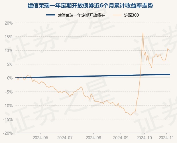 证券之星消息,11月6日,建信荣瑞一年定期开放债券最新单位净值为1.047元,累计净值为1.077元,较前一交易日上涨0.01%。历史数据显示该基金近1个月上涨0.22%,近3个月上涨0.59%,近6个月上涨1.22%,近1年上涨2.65%。该基金近6个月的累计收益率走势如下图:
