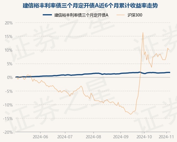 证券之星消息,11月6日,建信裕丰利率债三个月定开债A最新单位净值为1.0595元,累计净值为1.1165元,较前一交易日下跌0.02%。历史数据显示该基金近1个月上涨0.26%,近3个月上涨0.31%,近6个月上涨1.73%,近1年上涨4.17%。该基金近6个月的累计收益率走势如下图: