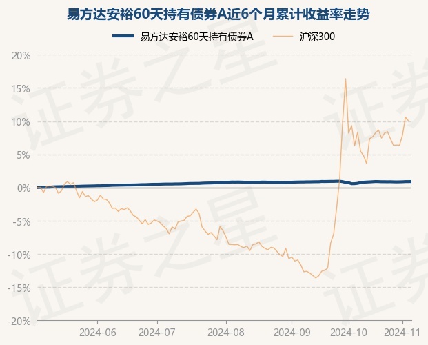 证券之星消息,11月6日,易方达安裕60天持有债券A最新单位净值为1.0468元,累计净值为1.0468元,较前一交易日上涨0.01%。历史数据显示该基金近1个月上涨0.13%,近3个月上涨0.09%,近6个月上涨0.91%,近1年上涨3.24%。该基金近6个月的累计收益率走势如下图: