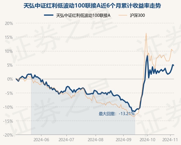 证券之星消息,11月6日,天弘中证红利低波动100联接A最新单位净值为1.6717元,累计净值为1.6717元,较前一交易日下跌0.24%。历史数据显示该基金近1个月下跌1.18%,近3个月上涨10.76%,近6个月上涨4.78%,近1年上涨12.84%。该基金近6个月的累计收益率走势如下图: