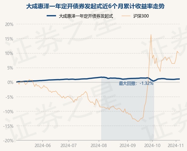 证券之星消息,11月6日,大成惠泽一年定开债券发起式最新单位净值为1.0241元,累计净值为1.1183元,较前一交易日上涨0.02%。历史数据显示该基金近1个月上涨0.3%,近3个月下跌0.56%,近6个月上涨1.06%,近1年上涨4.18%。该基金近6个月的累计收益率走势如下图: