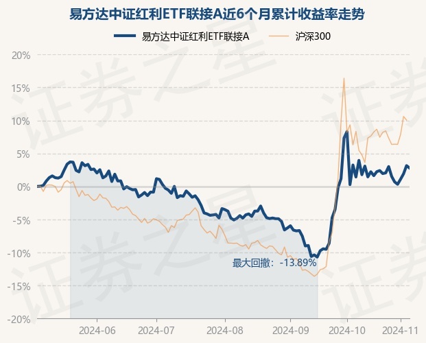 证券之星消息,11月6日,易方达中证红利ETF联接A最新单位净值为1.2223元,累计净值为1.4223元,较前一交易日下跌0.35%。历史数据显示该基金近1个月下跌4.15%,近3个月上涨8.37%,近6个月上涨2.87%,近1年上涨13.77%。该基金近6个月的累计收益率走势如下图: