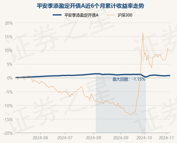 证券之星消息,11月6日,平安季添盈定开债A最新单位净值为1.1493元,累计净值为1.1982元,较前一交易日上涨0.02%。历史数据显示该基金近1个月上涨0.11%,近3个月下跌0.62%,近6个月上涨0.79%,近1年上涨3.47%。该基金近6个月的累计收益率走势如下图: