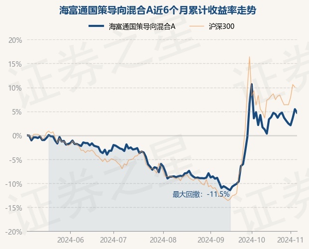 证券之星消息,11月6日,海富通国策导向混合A最新单位净值为1.8793元,累计净值为2.9184元,较前一交易日下跌0.7%。历史数据显示该基金近1个月下跌1.75%,近3个月上涨14.63%,近6个月上涨4.72%,近1年上涨9.3%。该基金近6个月的累计收益率走势如下图: