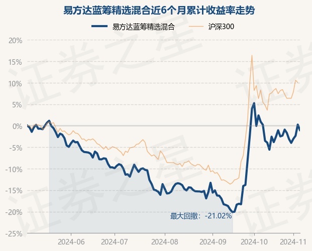 证券之星消息,11月6日,易方达蓝筹精选混合最新单位净值为1.8398元,累计净值为1.8398元,较前一交易日下跌1.28%。历史数据显示该基金近1个月下跌4.79%,近3个月上涨16.89%,近6个月下跌1.02%,近1年下跌6.64%。该基金近6个月的累计收益率走势如下图:
