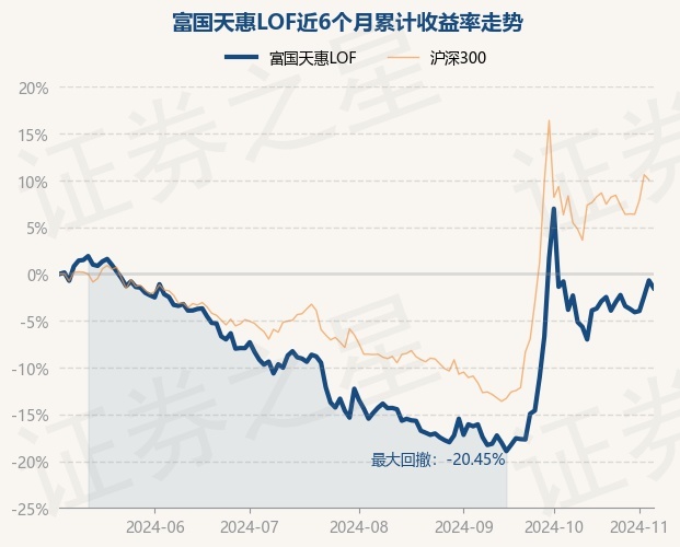 证券之星消息,11月6日,富国天惠LOF最新单位净值为2.5161元,累计净值为5.5641元,较前一交易日下跌0.82%。历史数据显示该基金近1个月下跌3.13%,近3个月上涨15.65%,近6个月下跌1.51%,近1年上涨0.13%。该基金近6个月的累计收益率走势如下图: