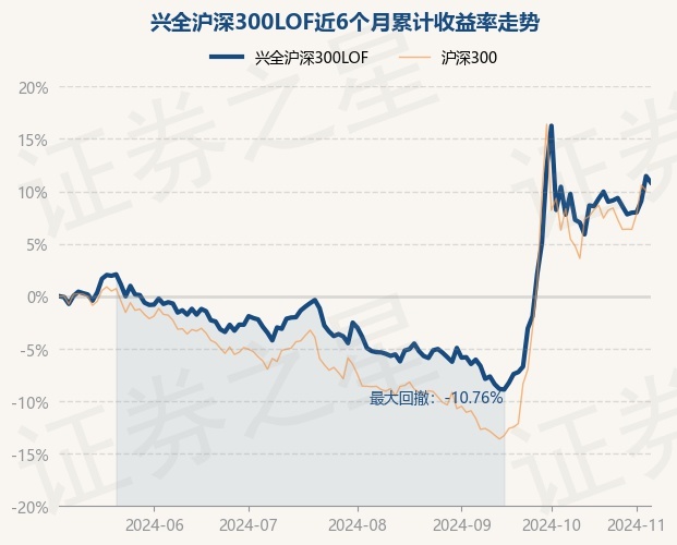 证券之星消息,11月6日,兴全沪深300LOF最新单位净值为2.4629元,累计净值为2.4629元,较前一交易日下跌0.55%。历史数据显示该基金近1个月下跌1.29%,近3个月上涨16.96%,近6个月上涨10.85%,近1年上涨14.56%。该基金近6个月的累计收益率走势如下图: