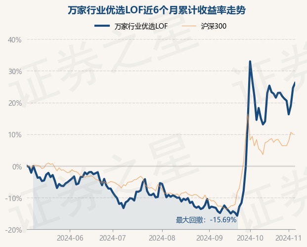 证券之星消息,11月6日,万家行业优选LOF最新单位净值为0.9651元,累计净值为4.3085元,较前一交易日上涨1.27%。历史数据显示该基金近1个月上涨9.45%,近3个月上涨38.88%,近6个月上涨26.22%,近1年下跌4.07%。该基金近6个月的累计收益率走势如下图: