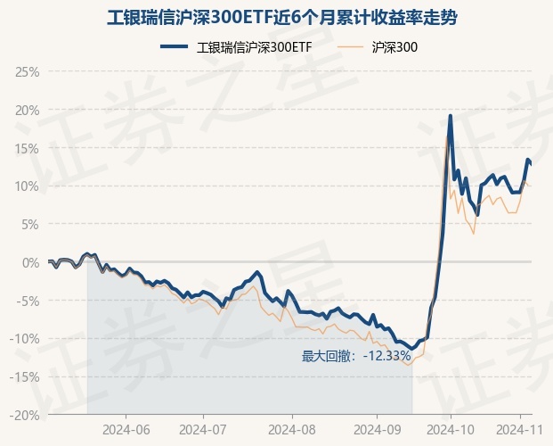 证券之星消息,11月6日,工银瑞信沪深300ETF最新单位净值为4.0606元,累计净值为1.153元,较前一交易日下跌0.49%。历史数据显示该基金近1个月上涨0.29%,近3个月上涨20.6%,近6个月上涨12.66%,近1年上涨13.77%。该基金近6个月的累计收益率走势如下图: