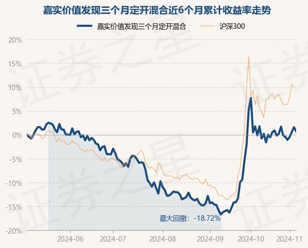 证券之星消息,11月6日,嘉实价值发现三个月定开混合最新单位净值为0.9882元,累计净值为1.0861元,较前一交易日下跌0.82%。历史数据显示该基金近1个月下跌4.32%,近3个月上涨15.44%,近6个月上涨0.75%,近1年上涨9.63%。该基金近6个月的累计收益率走势如下图: