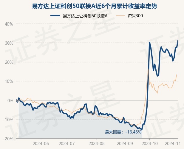 证券之星消息,11月7日,易方达上证科创50联接A最新单位净值为0.8015元,累计净值为0.8015元,较前一交易日上涨2.82%。历史数据显示该基金近1个月上涨16.46%,近3个月上涨41.63%,近6个月上涨31.16%,近1年上涨14.16%。该基金近6个月的累计收益率走势如下图: