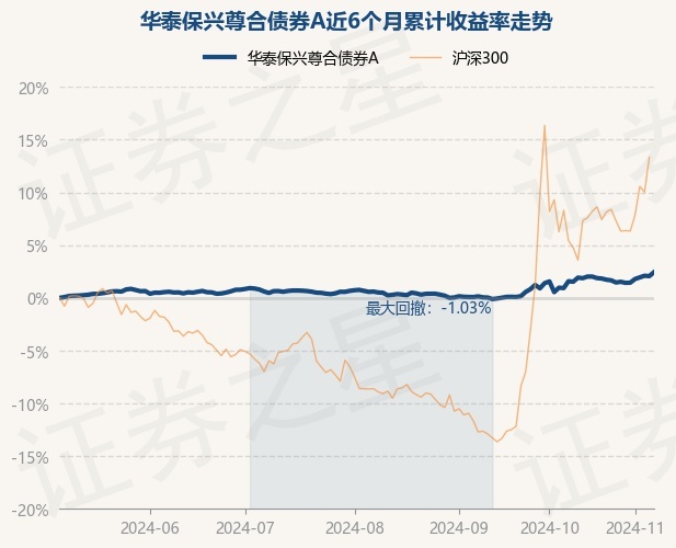 证券之星消息,11月7日,华泰保兴尊合债券A最新单位净值为1.2024元,累计净值为1.429元,较前一交易日上涨0.37%。历史数据显示该基金近1个月上涨1.03%,近3个月上涨1.83%,近6个月上涨2.44%,近1年上涨6.45%。该基金近6个月的累计收益率走势如下图: