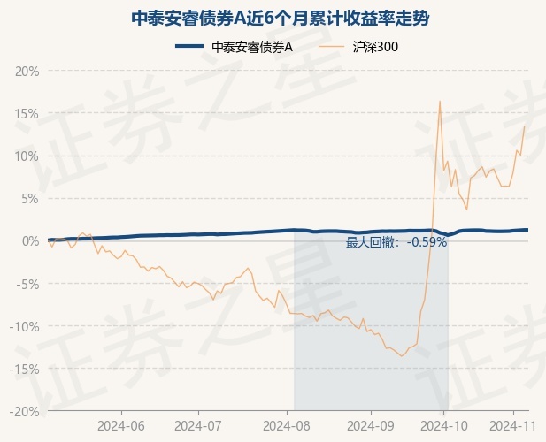 证券之星消息,11月7日,中泰安睿债券A最新单位净值为1.0384元,累计净值为1.0804元,较前一交易日上涨0.0%。历史数据显示该基金近1个月上涨0.39%,近3个月上涨0.08%,近6个月上涨1.25%,近1年上涨3.94%。该基金近6个月的累计收益率走势如下图:
