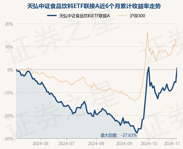 证券之星消息,11月7日,天弘中证食品饮料ETF联接A最新单位净值为2.458元,累计净值为2.5361元,较前一交易日上涨6.47%。历史数据显示该基金近1个月上涨2.07%,近3个月上涨22.95%,近6个月上涨0.54%,近1年下跌3.65%。该基金近6个月的累计收益率走势如下图: