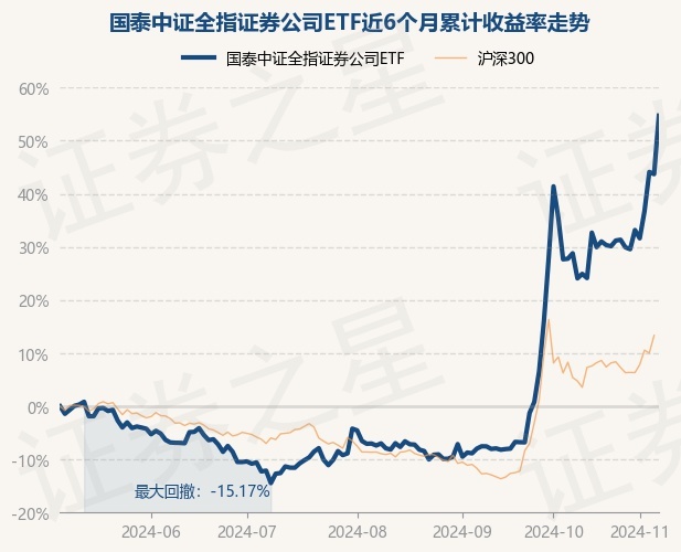 证券之星消息,11月7日,国泰中证全指证券公司ETF最新单位净值为1.3533元,累计净值为1.3533元,较前一交易日上涨7.65%。历史数据显示该基金近1个月上涨20.87%,近3个月上涨67.01%,近6个月上涨54.7%,近1年上涨36.97%。该基金近6个月的累计收益率走势如下图: