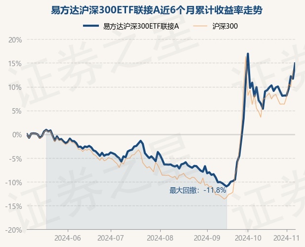 证券之星消息,11月7日,易方达沪深300ETF联接A最新单位净值为1.6288元,累计净值为1.6288元,较前一交易日上涨2.89%。历史数据显示该基金近1个月上涨3.27%,近3个月上涨22.75%,近6个月上涨14.91%,近1年上涨16.3%。该基金近6个月的累计收益率走势如下图: