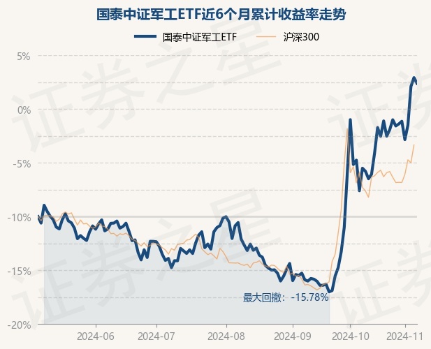 证券之星消息,11月7日,国泰中证军工ETF最新单位净值为1.1504元,累计净值为1.1504元,较前一交易日下跌0.85%。历史数据显示该基金近1个月上涨15.49%,近3个月上涨26.18%,近6个月上涨24.79%,近1年上涨17.45%。该基金近6个月的累计收益率走势如下图: