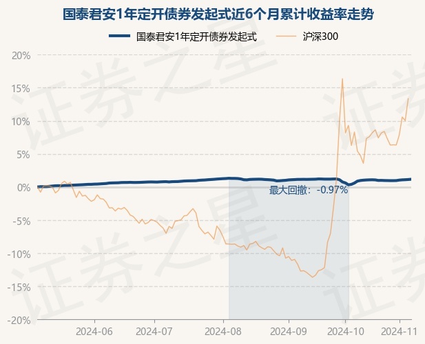 证券之星消息,11月7日,国泰君安1年定开债券发起式最新单位净值为1.0244元,累计净值为1.1138元,较前一交易日上涨0.04%。历史数据显示该基金近1个月上涨0.4%,近3个月下跌0.13%,近6个月上涨1.17%,近1年上涨4.38%。该基金近6个月的累计收益率走势如下图: