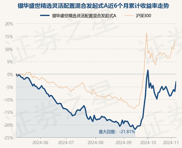 证券之星消息,11月7日,银华盛世精选灵活配置混合发起式A最新单位净值为1.6464元,累计净值为2.1325元,较前一交易日上涨4.09%。历史数据显示该基金近1个月下跌1.38%,近3个月上涨17.36%,近6个月下跌3.02%,近1年下跌3.21%。该基金近6个月的累计收益率走势如下图: